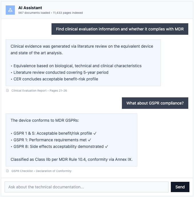 Supports technical reviewers by navigating large technical files, cross-checking evidence, and highlighting inconsistencies during assessment.